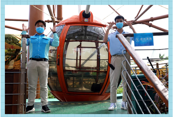 ●進入游玩項目后,全部游客采取間隔座位、間隔轎廂等防護措施盡可能避免人員直接接觸,實行一客一消毒。
