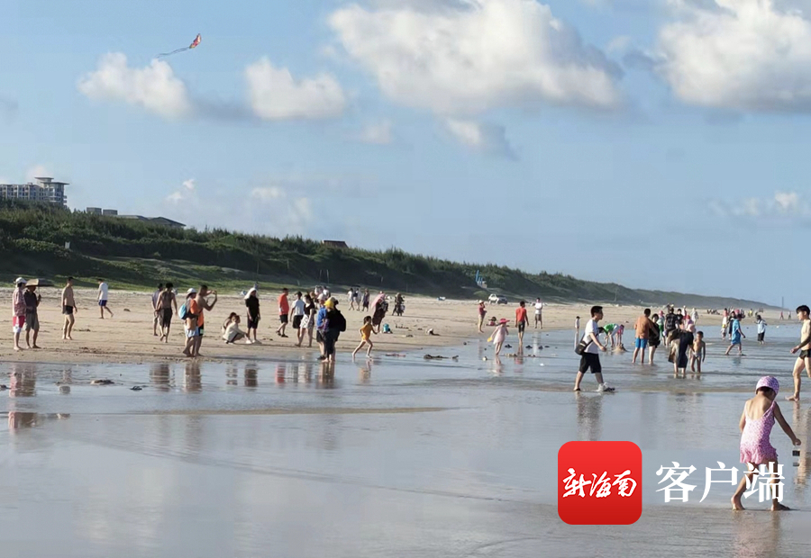 傍晚,潮水退后,裸露的灘涂一望無際,來不及隨潮水退去的魚蝦、螃蟹、各種貝類等遍布沙灘。記者看到,游客們和附近村民攜帶各類趕海工具各顯神通,灘涂上一派歡騰。