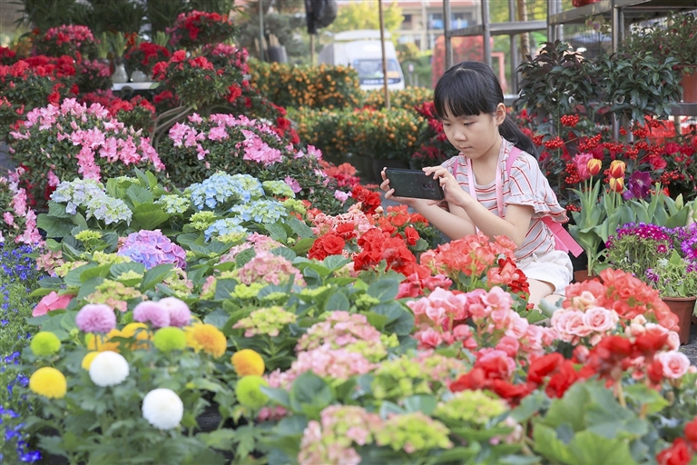 1月25日,一名小朋友在花叢中用手機記錄五顏六色的鮮花。三亞日報記者 陳聰聰 攝