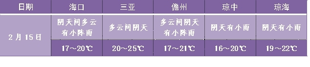 陸地天氣預報:預計2月15日,受偏東氣流影響,海南島北部、東部和中部地區(qū)多云間陰天有小陣雨,西部和南部地區(qū)以多云天氣為主。最高氣溫北部、東部和中部地區(qū)18~22℃,西部和南部地區(qū)23~26℃;最低氣溫全島15~20℃。