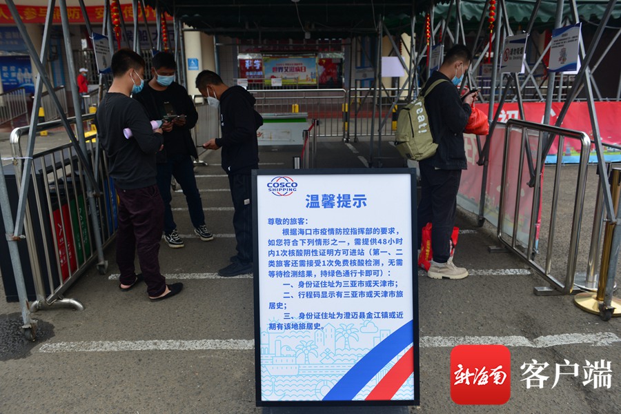新海南客戶端、南海網(wǎng)、南國都市報3月2日消息(記者 陳衛(wèi)東)3月2日,記者在海口秀英港看到,售票大廳門口有溫馨提示,根據(jù)海口市疫情防控指揮部的要求,如果符合下列情形之一,需提供48小時內(nèi)1次核酸陰性證明方可進站: