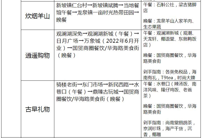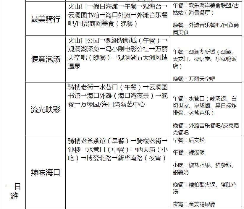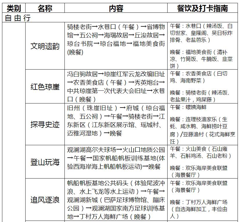 海口市旅行社協(xié)會秘書長麥偉文介紹,海口旅文局此次結(jié)合常態(tài)化疫情形勢下旅游消費市場需求變化,針對游客群體中的青年群體、女性群體、商旅人士和家庭群體,圍繞海口火山、海岸等自然資源和騎樓等人文資源,推出歷史文化游、體育運動游、都市休閑游、美景美食游、網(wǎng)紅打卡游、親子研學游、美麗鄉(xiāng)村游和特色購物游等八大專題自由行線路(含一日游、二日游、三日游)共23條。市民游客可根據(jù)時間及需求組合安排,把一日游組合成兩日游、三日游的線路也達百余條。每一個主題線路都是以海口資源情況和不同年齡層次游客需求深入剖析后作出的包裝規(guī)劃。
