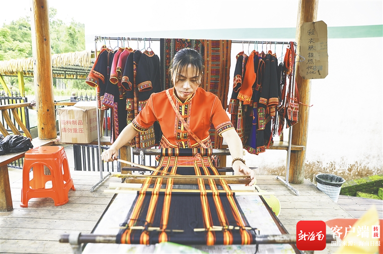 涼亭下,村民王葉偵正織著黎錦,身旁擺放的手工茶葉、黎錦服裝、黎家米酒等別具特色,吸引不少人駐足購買,“村子里游客多了,一天忙活下來,我能掙到上百元。”