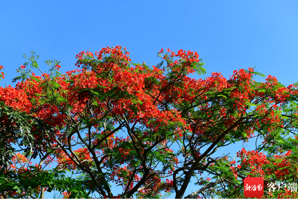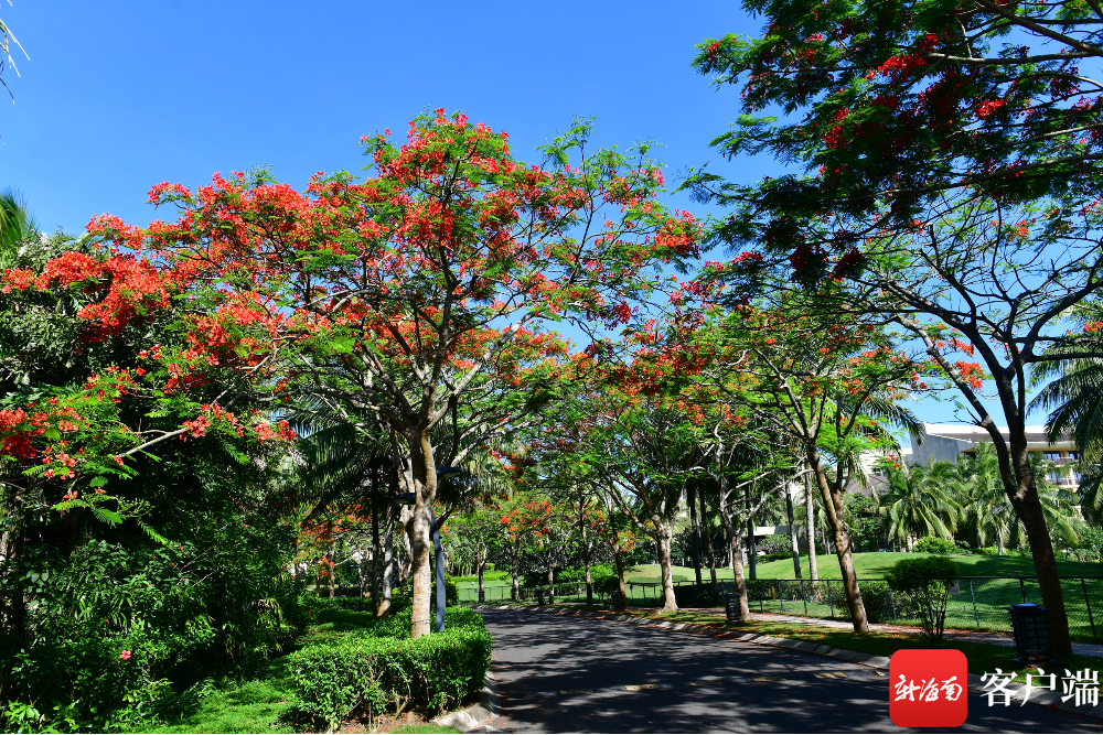 新海南客戶端、南海網(wǎng)、南國都市報5月22日消息(記者 陳衛(wèi)東)萬寧神州半島有條路叫鳳凰路,約1公里長,路兩旁全是鳳凰樹,眼下正是鳳凰花的盛花期,滿樹鳳凰花如火如荼地開著,火紅的花蕊在藍天和綠葉的映襯下,格外妖嬈艷麗。