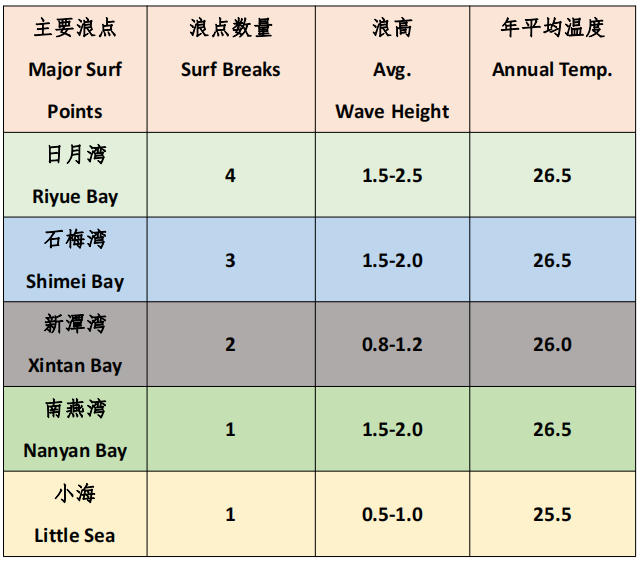 與世界知名沖浪勝地夏威夷同緯度的萬(wàn)寧日月灣是世界上少有的擁有高質(zhì)量定點(diǎn)浪型和沙灘浪型的海域之一,海浪綿長(zhǎng)有力、起伏頻率高,年平均溫度26.5℃,年平均浪高1.5米至2米,全年都適宜沖浪,平均2米的大浪是從10月到次年3月,長(zhǎng)達(dá)半年。