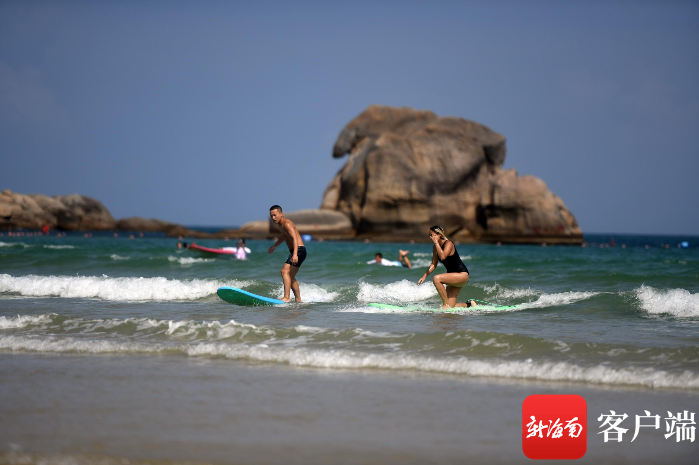 游客在陵水呆呆島沖浪。