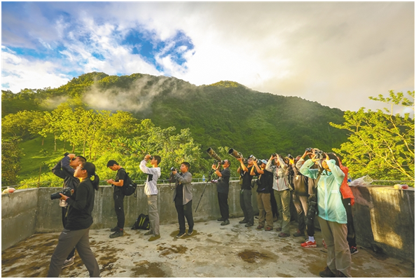 ↑在海南鸚哥嶺國(guó)家級(jí)自然保護(hù)區(qū),參加研學(xué)旅行的學(xué)生一起觀察鳥類活動(dòng)。海南日?qǐng)?bào)記者 袁琛 攝