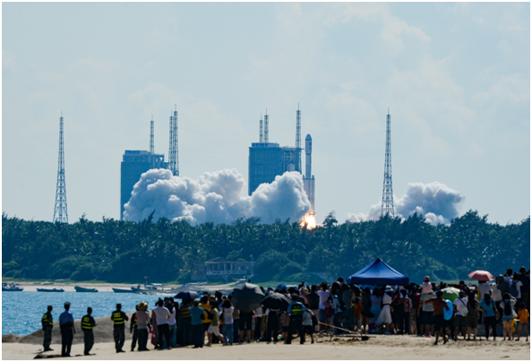 ↑游客在文昌市觀看火箭發(fā)射。新華社記者 周佳誼 攝