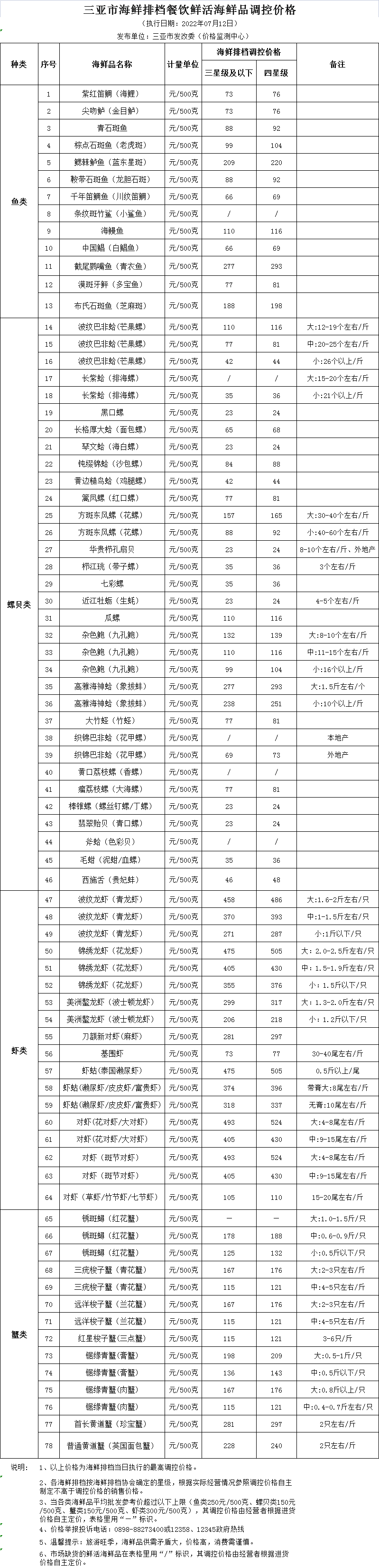 三亞市海鮮排檔餐飲鮮活海鮮品調控價格(2022.07.12)