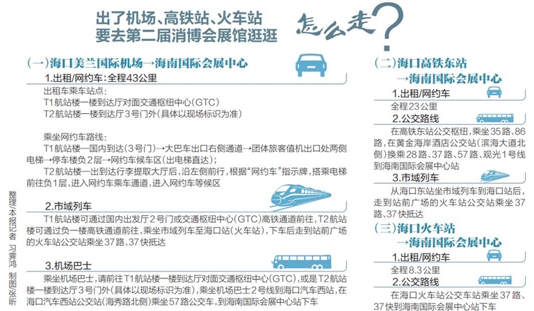 為完善交通出行體驗,第二屆消博會展館周邊新增了3條貫通道路,交通疏導能力進一步提升。加之在展館周邊以安排社會車輛停靠點、開通消博會專線和接駁線、增加公交車發班密度、加大網約車引導力度、利用導航系統精準調度出租車等方式,將全力保障展會期間的出行需求。
