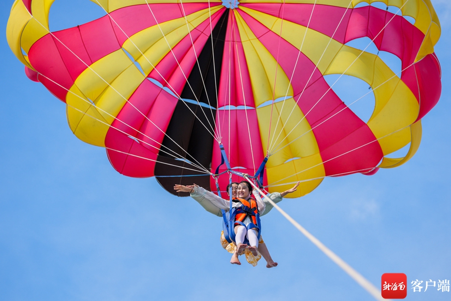 資料圖:游客在三亞蜈支洲島旅游區(qū)體驗彩虹拖傘。武昊 攝