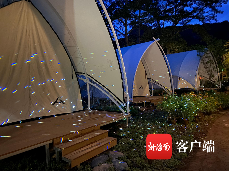 黎山麓營地是由王下鄉三派村合作社與云畫文旅公司共同設立,在村子游客中心搭建11頂帳篷。李海輝介紹,船型豪華帳融入海南黎族船型屋非遺文化,讓游客感受到少數民族的非遺魅力;星空帳篷頂部為透明的,游客可在屋內仰望星空,伴著夜色入眠。