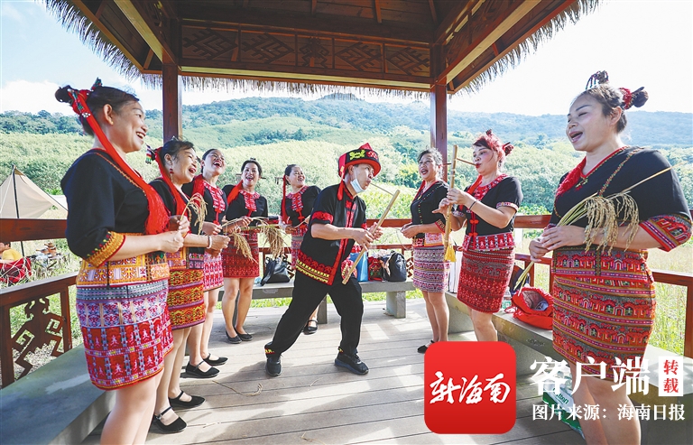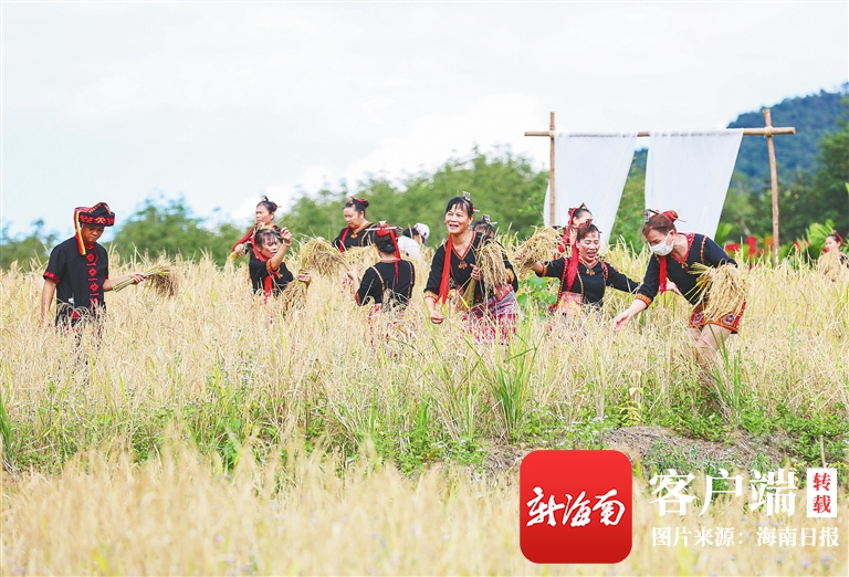以山蘭稻田為舞臺,以綠水青山為幕布,身穿節(jié)日盛裝的黎族兒女穿梭在稻田間,手拉手歡唱《捻稻歌》等,歡快的歌聲飄揚在群山之間,古老而又淳樸的農(nóng)耕畫面展現(xiàn)于眾人眼前,也預(yù)示著人與大自然和諧相處、互相依存、共同發(fā)展的美好明天。在這一獨具民族特色的豐收慶典里,遠道而來的賓朋還饒有興致地體驗收割、舂米等黎族傳統(tǒng)稻作農(nóng)事。