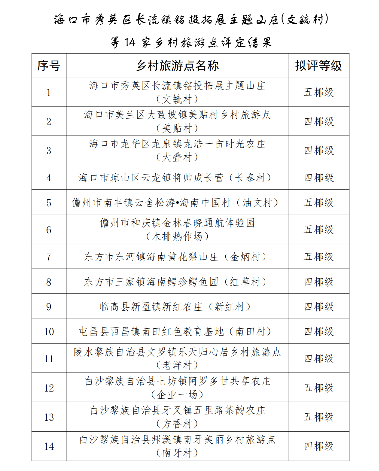 新海南客戶端、南海網、南國都市報11月30日消息(記者 丁文文)11月30日,海南省旅文廳發布消息,海口市秀英區長流鎮銘投拓展主題山莊(文毓村)等14家鄉村旅游點評定結果正在公示。
