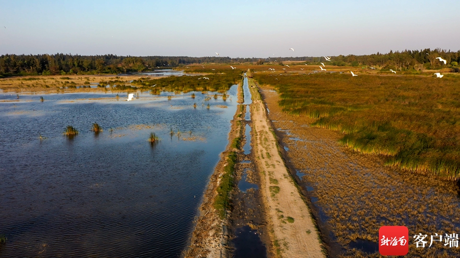 新海南客戶端、南海網(wǎng)、南國(guó)都市報(bào)2月13日消息(記者 劉孫謀)當(dāng)無人機(jī)穿越碧綠的海水,俯瞰在木麻黃林間的昌江旅游公路,在昌江海尾濕地公園路段,路面已經(jīng)鋪上瀝青。行走在該路段時(shí),不僅可以享受徐徐海風(fēng)吹來,還能觀看越冬水鳥以及林鳥。夕陽(yáng)下,濕地里成群結(jié)隊(duì)的白鷺在此覓食,白骨頂雞在濕地里覓食,人與動(dòng)物近距離相處,守望著這優(yōu)美生態(tài),晚霞余暉海天一色。