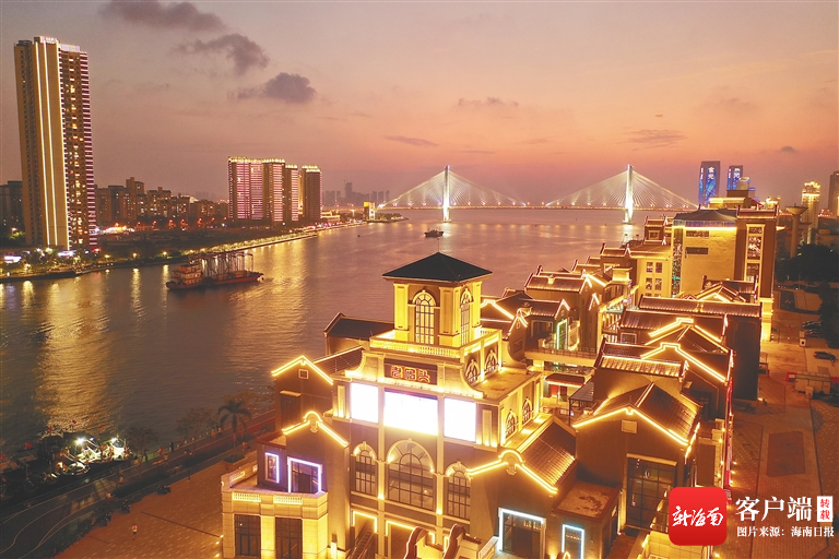 隔著海甸溪遙望對面的海口東坡老碼頭風情商業街,古典雅致的建筑錯落有致,深灰色的墻衣搭配富有年代感的瓦片,在璀璨的霓虹映照下,仿佛穿越回曾經繁榮的老碼頭。