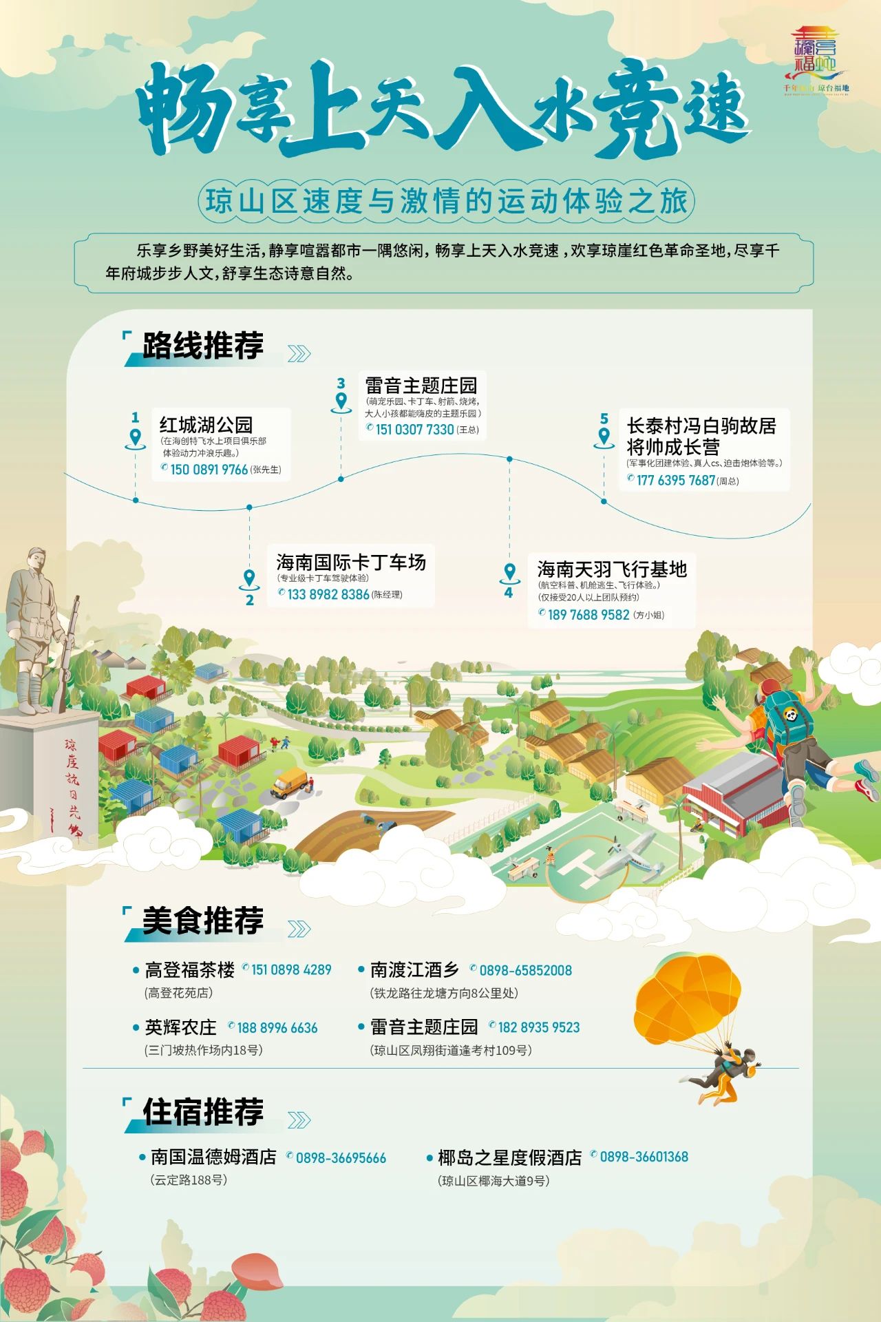 紅城湖公園體驗動力沖浪——海南國際卡丁車場體驗專業級卡丁車駕駛——雷音主題莊園體驗射箭——長泰村馮白駒故居將帥成長營體驗真人cs——海南天羽飛行基地體驗飛行