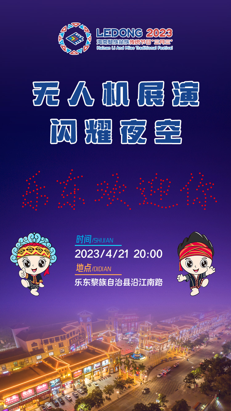 新海南客戶端、南海網、南國都市報4月17日消息(記者 張宏波)2023年海南黎族苗族傳統節日“三月三”主會場節慶活動將于4月22至24日在樂東舉行。作為此次主會場節慶活動的重要節目之一,無人機展演將于4月21日晚8點在樂東沿江南路精彩上演。