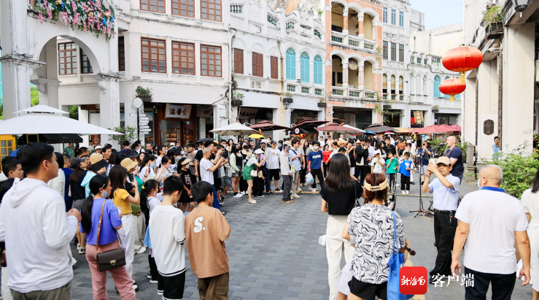 市民游客在海口騎樓老街看演出。海口市旅文局供圖