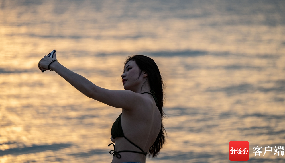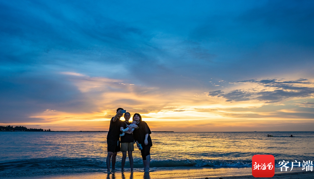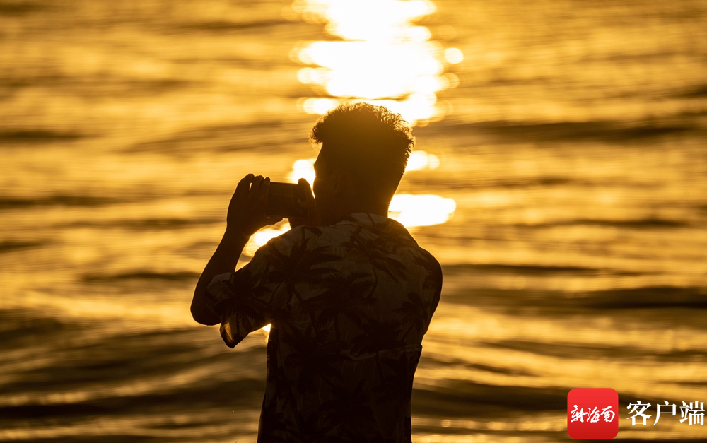 在海口市西海岸的棲海岸露營基地的海灘上,市民拍攝夕陽。記者 劉孫謀 攝