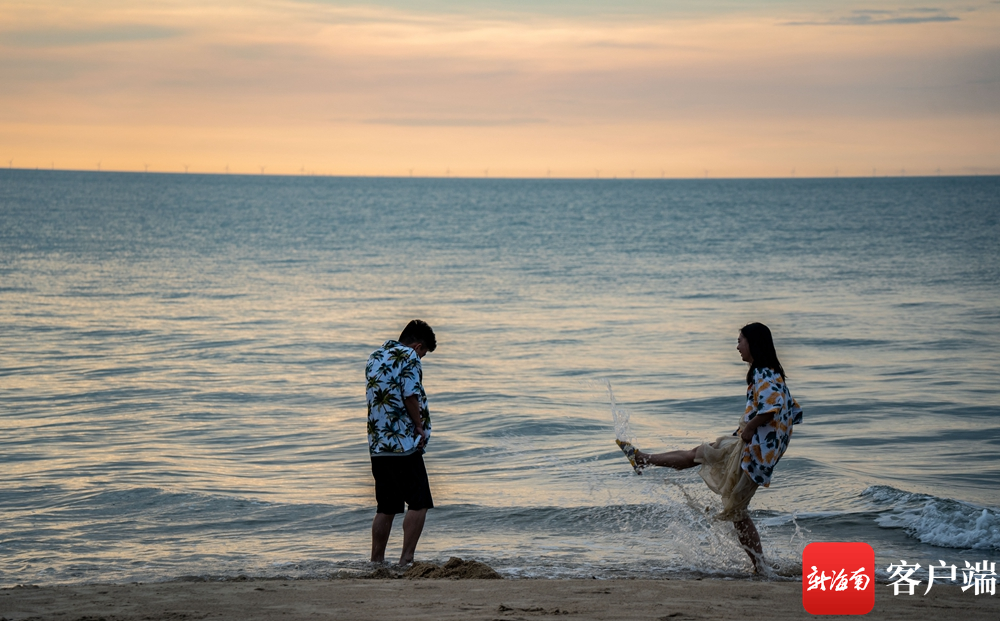 在海口市西海岸的棲海岸露營基地的海灘上,一對情侶在戲水。記者 劉孫謀 攝