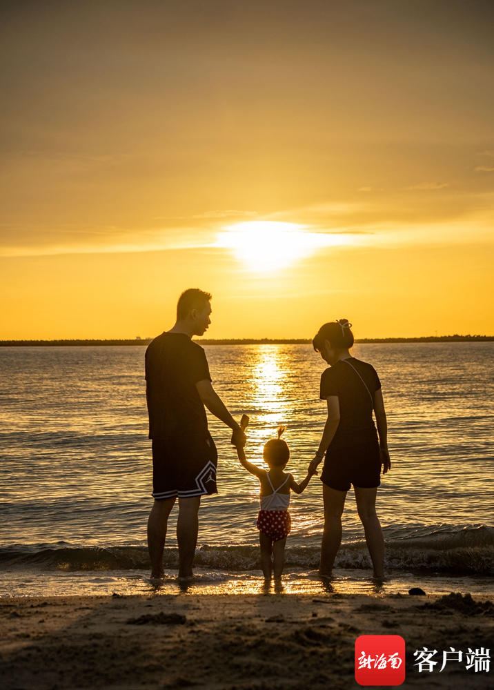 在海口市西海岸的棲海岸露營基地的海灘上,一家三口在戲水。記者 劉孫謀 攝