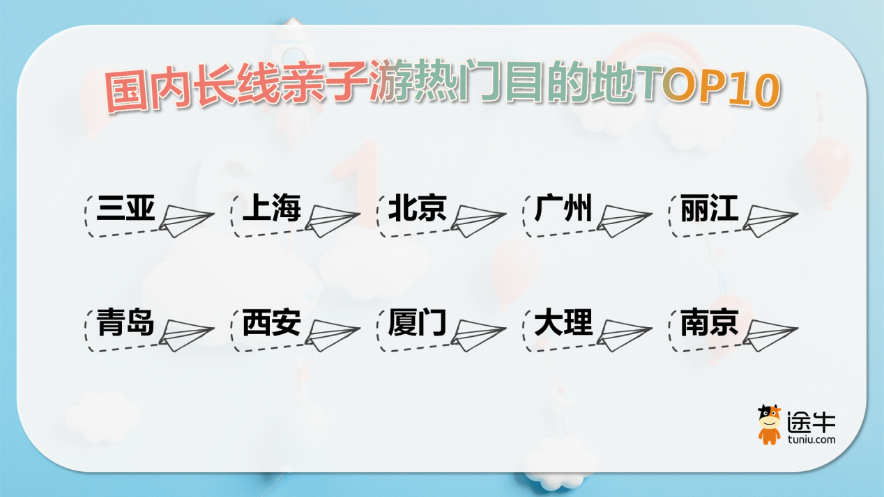 值得一提的是,國內長線親子游目的地中,三亞、上海、北京、廣州、麗江、青島、西安、廈門、大理、南京等目的地成為家長們的熱門選擇。出境親子游方面,除中國香港、中國澳門外,泰國、新加坡、馬爾代夫等目的地熱度更為靠前。