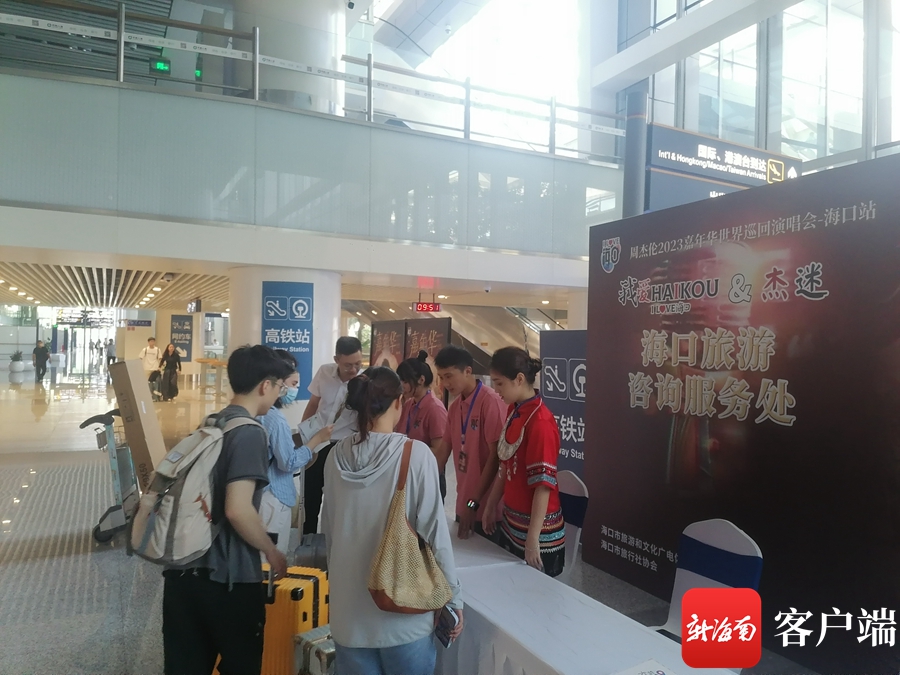 ?“杰迷”們?cè)诼糜巫稍兎?wù)臺(tái)前咨詢。海口市旅文局供圖