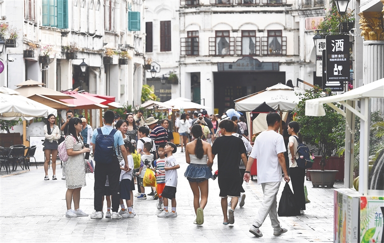 6月24日,游客在海口騎樓老街游覽。端午小長假期間,人們以各種方式休閑娛樂,享受假日時光。新華社記者 楊冠宇 攝