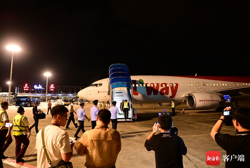 7月6日,由德威航空執飛的TW621航班搭載著125名旅客從韓國首爾抵達三亞鳳凰國際機場。記者沙曉峰 攝