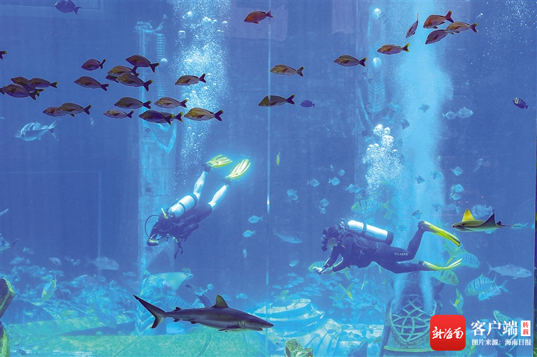 ?在三亞·亞特蘭蒂斯水族館,青年游客在水中與魚兒伴游。記者 王程龍 攝